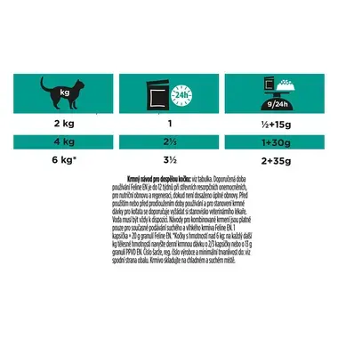 *Mačky s hmotnosťou nad 6kg: na každý ďalší kilogram telesnej hmotnosti navýšte dennú kŕmnu dávku o 2/3 kapsičky alebo o 13g granúl PPVD EN.